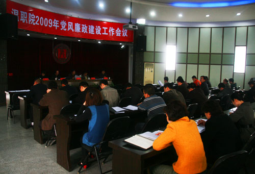 为传达贯彻省市有关纪检监察会议精神,总结回顾上学期我院纪检监察工作,研究布置2009年我院党风廉政建设工作, 3月19日下午在行政楼一楼多功能厅召开了我院2009年党风廉政建设工作会议。院党委委员、纪委书记何忠主持会议并作重要讲话,院党委委员、纪委副书记、监察审计室主任陈维彬作了工作报告。院纪委全体委员、各党总支直属党支部书记和纪检委员、各党政处室负责人参加了会议。