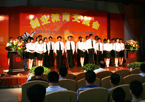 此次创业教育经验交流会在20多名大学生朗诵《创业的梦想》中拉开帷幕。来自8个系的书记和主任轮流上场作8分钟的创业教育工作陈述,随后,由示范办专家和教师就创业教育示范点建设的相关问题进行提问,进行经验交流。