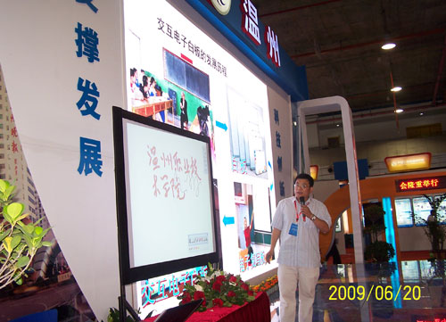 在展出期间,作为国家示范性高职建设院校,我院的摊位颇受市民欢迎,华东老师还受邀举行交互式电子白板产品发布会,温州电视台经济频道还现场采访了华东老师。轻工系参展的意大利精品鞋纯手工现场演绎还受到了外国友人的热捧,摊位前许多外宾流连忘返。通过本次科交会,我院向社会各界充分展示了智力资源方面的聚集优势以及服务地方经济的能力。