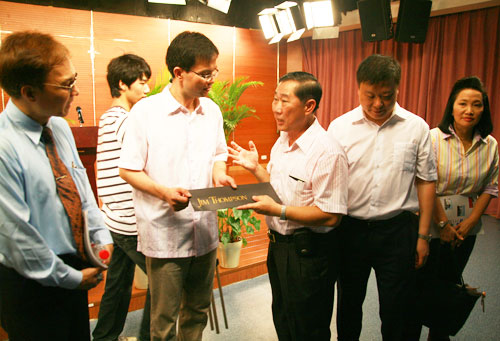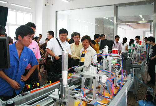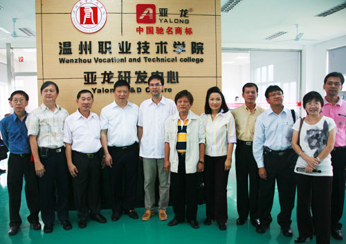 据了解,本次东盟教育考察团是受我院合作办学多年的亚龙科技集团公司的邀请,由泰国劳工部技能发展厅副厅长苏瓦先生为团长来温考察民营企业发展和职业教育情况。考察团在我院院长丁金昌、亚龙公司总经理陈继权等人的陪同下,参观了我院与亚龙集团合作共建的研发中心以及机械系、建工系、轻工系、电气系、人文系生产性实训基地。每到一处,考察团成员发出了啧啧的惊叹声,我院的生产性实训基地建设的理念、人才培养模式、学做合一的高职教育理念深深吸引了外国友人,他们用手中的相机不断地“记录”下他们眼中新鲜的事物。生产性实训基地中悬挂的职业教育理念、先进的实训设备以及实训学生的实习手册都被考察团成员一一“记录”进镜头里。在参观的时候,客人们还不时地向丁金昌院长询问一些详细的情况。“学校的规模如何?”、“为什么要建生产性实训基地?”、“学生毕业了之后主要是升学还是直接走向工作岗位?就业情况如何?”……客人们的问题一个接着一个,充满了强烈的好奇心。