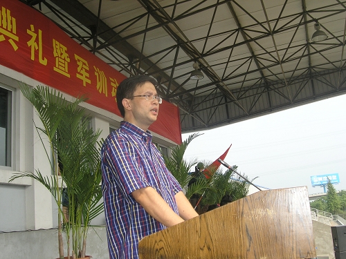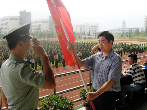最后,陈光天书记为军训团授旗,标志着为期一周的军训工作正式启动,2009级的新生将用军训来为崭新的大学生活开幕。