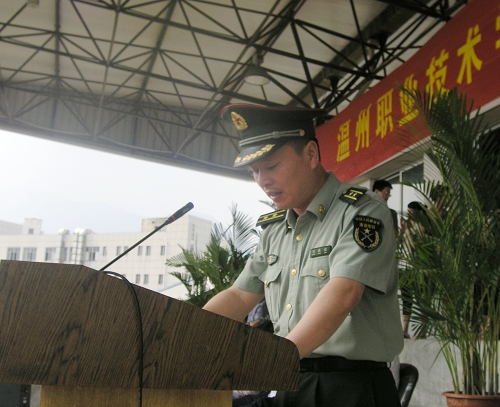 陈光天书记为军训团授旗,标志着为期一周的军训工作正式启动 金秋九月,是一个采撷丰收硕果的季节,更是一个孕育希望和生机的季节,新一届温职院学子怀着年轻的梦想、扬着理想的风帆,来到了美丽的温州职业技术学院,揭开了人生中朝气蓬勃的新一页。