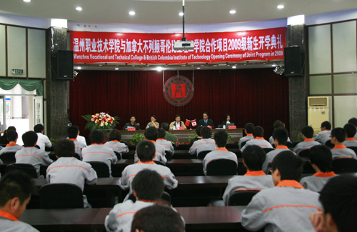 合影留念 2009年11月9日上午,温州职业技术学院与加拿大不列颠哥伦比亚理工学院(British Institute of Technology,以下简称BCIT)合作项目2009级新生开学典礼在行政楼隆重举行。温州职业技术学院副院长夏晓军,加拿大不列颠哥伦比亚理工学院代表Cyrus Raoufi博士、Tracy Wang,相关部门负责人及机械系中加班09级新生到会。典礼由机械系主任吴百中主持。