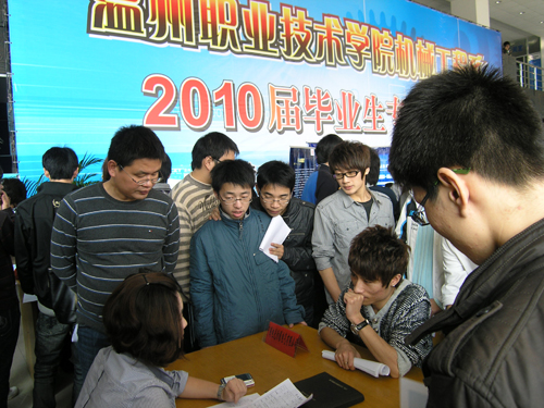 在温州职业技术学院机械工程系2010届毕业生专场招聘会现场,记者看到了60多家企业一字排开,其中不乏合兴集团、瑞立集团、亚龙科技、温州意华接插件有限公司等温州知名企业,多半企业招聘的是机械设计制造、模具加工制作、数控加工、机电一体化等技术人员。据悉,本场招聘会共提供了895个工作岗位。1000多名毕业生把整个招聘会围得水泄不通。这次招聘会,在需求人才的学历层次、知识技能、岗位要求等方面与平时有较大变化,呈现明显的“两高”现象。“两高”是指一线操作人员需求比例高,技能要求高。据统计,用人单位招聘人才到生产、销售一线工作的约占70%左右,并且普遍要求具备一定的专业技能,如工作经验、实践实习基础或一技之长。一家阀门有限公司的招聘负责人当场拿出了机械设计图纸和应聘学生们“纸上谈兵”,现场考核毕业生的专业技能。“这次我们不仅招一些销售等一线员工,还要招聘技术人员,”海特克液压公司的招聘主管说,“公司最需要的是一批上班即能上岗的员工,温职院学生每次都能给我们带来意外的惊喜,这也是我们长期过来招生的原因”。看到自己培养的又一批毕业生深受企业欢迎,内心最高兴当属温职院机械系主任吴百中,他掩饰不了内心的喜悦之情,告诉记者说,看到今年前来招聘的企业如此火爆,让我们在看到金融危机过后,经济有复苏的迹象,制造业旺盛的人才需求态势,同时也说明我院培养的学生得到了企业乃至全社会的认可。