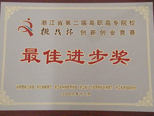 2009年12月11日至13日,由共青团浙江省委员会、浙江省教育厅、浙江省科学技术协会、浙江省人力资源和社会保障厅、浙江省学生联合会共同发起主办的浙江省第二届高职高专院校“挑战杯”创新创业竞赛在杭举行。我院荣获“最佳进步奖”。