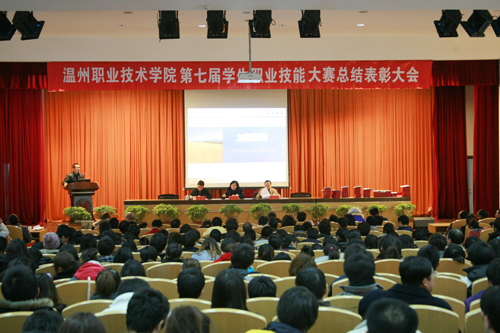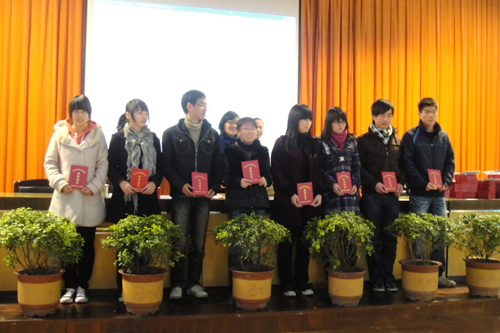 颁奖仪式 1月6日下午,我院在学术报告厅召开第七届学生职业技能大赛暨2009年度参加全国、省、市职业技能大赛获奖学生表彰大会。副院长王向红,各系领导,获奖选手、指导老师以及各班班长参加了本次会议。大会由教务处副处长余剑敏主持。