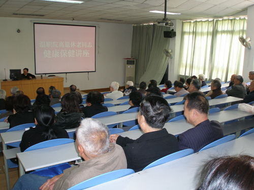 4月30日上午我院离退休管理处在成教学院举办离退休老同志健康保健讲座。主讲人系温州市二医、三医、中医院原副院长,市第五医院、肿瘤医院原院长王宪浩同志。