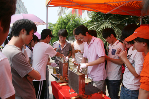 5月26日,为丰富师生的校园文化生活,提升校园美食文化品味,温州职业技术学院成功举办了首届“校园美食文化节”。在本学期初,四方公司筹委会就开始了各项筹备工作,本次报名参加的参展商就有五十多家,各参展商为推出自己的特色,早早做足了功课。现场参与的各种点心、风味小吃,品种多达100余种。今天一早各参展商就开始逐步就位,广大师生也“闻香而来”,纷纷驻足活动现场,现场气氛热闹非凡。