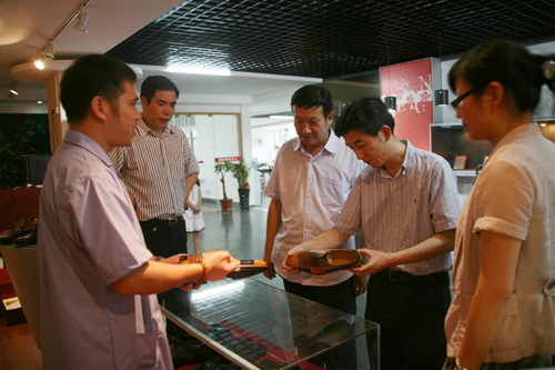 仇杨均副市长细致查看了学生设计的鞋样作品 7月5日,温州市副市长仇杨均在市政府副秘书长谢树华的陪同下来我院视察工作。这是仇杨均副市长上任后第一次来高教园区视察工作。