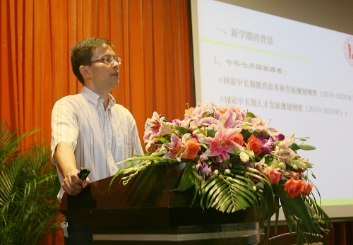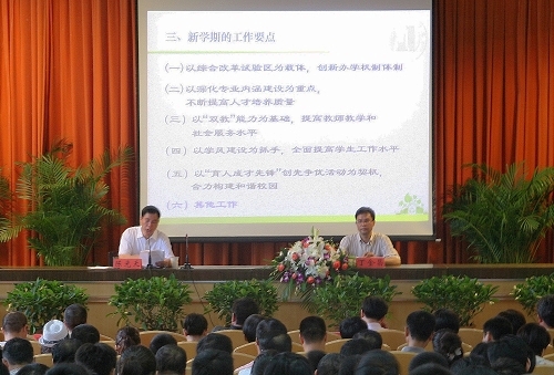 之后,丁院长分析了在即将开启的后示范时期我们将面临的各种压力,要求大家在已经取得的新成绩、新荣誉面前要居安思危,并重点对新学期工作作进行了部署。他通报了新学期学院工作的指导思想是:以科学发展观为指导,深入开展“争先创优”活动;以综合改革试验区为载体,推进办学体制机制创新;以深化专业内涵建设为重点,不断提高人才培养质量;以学风建设为抓手,全面提高学生工作水平;以“双教”能力为基础,提升教师教学和社会服务能力,在新的起点上科学规划学院的发展,努力把学院建设成一所全国一流的高职院校,为区域经济社会发展做出更大的贡献。