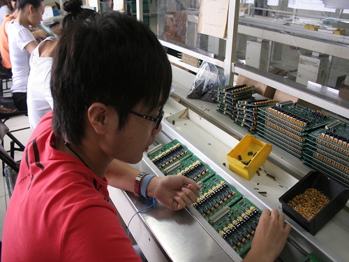 聚精会神地装配 暑期期间,由我系辅导员孙建华带领,吕晓、成大业等9名党员(含预备党员)为实施党建活动,体验企业文化,走进我系的校外党建共建基地之一——申瓯通信设备有限公司,开始了近一个月的实习生活。