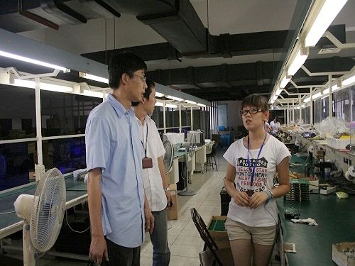 实践过程中,在生产部经理杨仲盛的安排下,九个人分成三小组,由企业党员指导,依次在第一车间、第三车间、SMT车间学习。第一车间是补焊和插件区,学的是基本技术,例如熟练掌握电烙铁的使用、尖嘴钳的正确握法、辨别元器件等。在第三车间,学生可以学到整机组装和调试,尤其是调试部分,蕴含了大量的理论,通过实际操作,加深印象。SMT车间采用了最先进的设备,具有自动流焊、自动贴片等一系列功能,高新的设备让同学们大开眼界,使其领悟到学好专业的重要性。