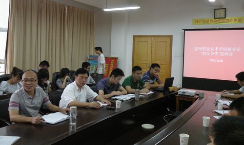 会上,苏跃飞副处长介绍了《温州职业技术学院辅导员考核办法(草案)》,希望通过规范、有效的考核,加强辅导员队伍管理,提升辅导员队伍的素质和工作能力。蔡后界处长强调辅导员工作的规范化和制度化,辅导员工作要走内涵式发展道路;要求辅导员加强自身建设,紧密围绕学院工作中心开展学生工作,把“创先争优”落实到具体的学生教育管理工作中,进一步提高学生工作水平。