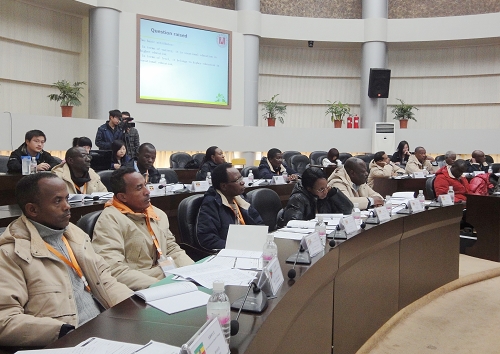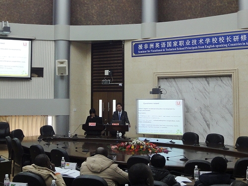 丁院长与翻译吴安萍老师合影 11月17日,丁金昌院长应邀为“援非洲英语国家职业技术学校校长研修班”作了题为《基于“三性”的高职院校发展研究与实践》的报告。丁院长从高职教育的区域性、实践性和高教性出发,就我院“三个三结合”的人才培养方案设计、“三个合一”的实践教学体系和应用研究与服务机构的设置作了详尽的介绍,并与学员进行了很好的互动。