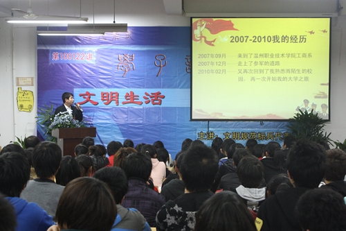 “文明生活健康成才”旨在强化理想信念、坚定志向追求。讲师们通过他们不同的经历为大家分享了他们的体会与成长之路。曾经在海军训练基地经历2年军旅生活的陈淮同学和在场的同学分享了他从部队退伍后回到大学继续求学的习经历。作为励志求学典范的李红瑜同学,品学兼优的她与我们一同回顾了她大学连续四次获得一等奖学金并且活跃于各类职业技能比赛的精彩生活。另一位优秀学生讲师,现任系学生会副主席,院工商管理协会会长的陈瑞晶同学向大家展示了她参加比赛的风采以及她在学习、生活、工作方面的心得。优秀学生讲师、英语等级考试中成绩优异的周驰冰同学以风趣幽默的语言风格向大家传授他学习英语的巧妙方法。
