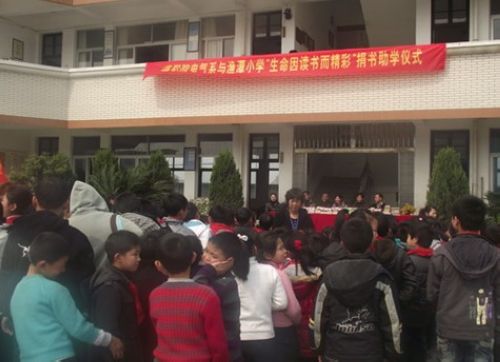 渔潭小学校长项武杰致欢迎辞,电气系晁拥军书记发表讲话。在《爱的奉献》的音乐伴奏下,十位小学生为两个学校的老师系上鲜艳的红领巾,老师们向学生代表献上200余册的精美图书。随后,双方举行了青年志愿者基地授牌仪式,并就本学期要开展的日常活动进行了具体商议。
