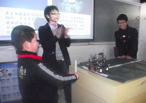 同时,由电气系获得2009年全国机器人大赛冠军的同学,给小学高年级的学生上机器人培训课程。自动化0802钟磊同学,随身带来系部研发的AS-MF灭火机器人、AS-U2吸尘机器人、跳舞机器人三种机器人实物器件,向小学五年级学生分别介绍了它们的配置、功能与实际运用,并做了现场展示。在钟磊同学激情而又生动的讲述下,孩子们听得全神贯注,兴致勃勃,如痴如醉。