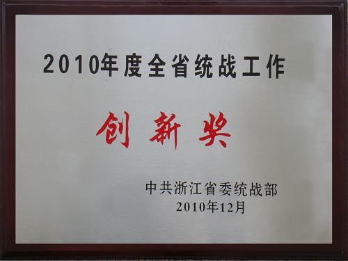 在日前召开的全省统战部长会议上,浙江省委统战部表彰了2010年度全省统战工作创新奖获奖单位,全省5个市级统战部、22个县级统战部及浙江工业大学、浙江师范大学、温州职业技术学院等三所高校获得表彰。