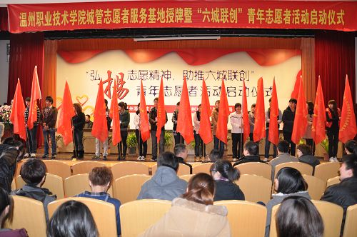 启动仪式上,温州市城管与执法局团委书记梁佳简要介绍了温州市城管志愿者总队成立以来开展志愿服务的活动情况。夏晓军副院长在致辞中勉励广大青年志愿者要发扬“奉献、友爱、互助、进步”的志愿精神,为将温州建设成富饶秀丽、和谐安康、宜居乐业的生态型现代化大都市贡献自己的力量。仪式上双方签署了志愿服务基地共建协议,并举行了温州市城管志愿者服务基地授牌。志愿者代表叶郁郁、张凤同学分别宣读了“六城联创”青年志愿者服务的活动方案和倡议书。参加仪式的领导同志还分别为3支“六城联创”志愿服务队及13支院系两级志愿服务总队、分队授旗。