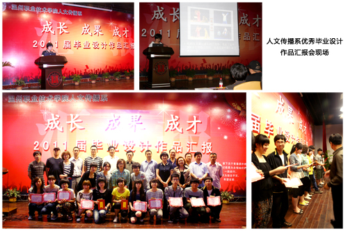 2011年6月3日下午,人文传播系2011届毕业设计汇报会在学院信息报告厅隆重举行。学院党委书记陈光天、院长丁金昌、党委副书记倪集崇、纪委书记何忠及相关职能部门、兄弟系部负责人、相关业界企业家、摄影协会专家等莅临指导。