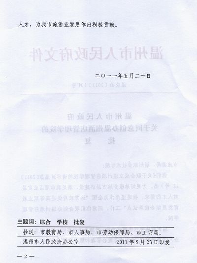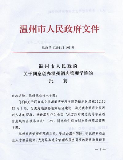 近日,我院与温州市旅游局联合成立温州酒店管理学院的申请获温州市人民政府批准,标志着我院第5个二级学院正式成立。这是我院“以服务地方经济为导向,依托行业、产学结合”办学理念的再次深化。