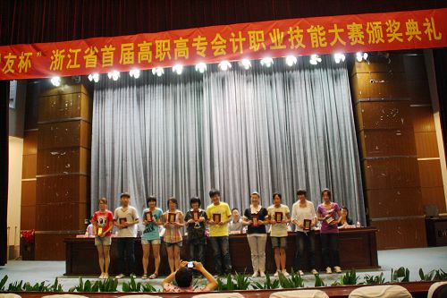 我院参赛学生合影 6月10日,由我院财会系6位学生组成的三支电算化代表队参加了2011年浙江省高职高专院校学生职业技能大赛首届会计职业技能竞赛。经过五个多小时的激烈角逐,我院两支代表队在一百多支队伍中脱颖而出:何美娟与潘芳芳组获得一等奖的第一名,张风铃和卢阿丹组获得二等奖。此次比赛突显了我院近年来会计电算化在教学方面取得的巨大进步及财会系学子扎实的基本功。