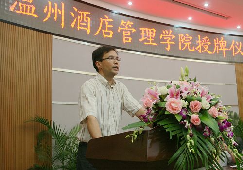 学院院长丁金昌致辞。丁院长就温州酒店管理学院的发展定位和办学思路进行了介绍,他指出,温州酒店管理学院将重点培养酒店管理高素质技术型专门人才,同时培训现有旅游管理人员和服务人员,该院的成立对提升温州酒店行业整体水平具有重大意义。