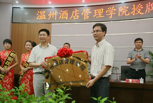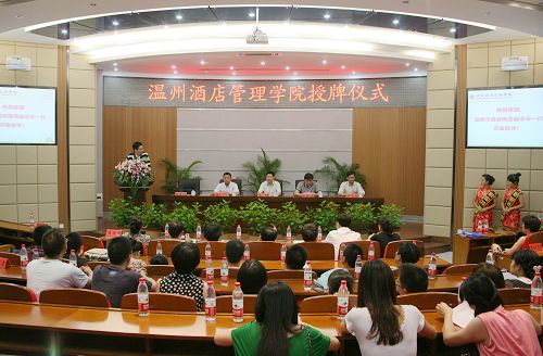 陈浩副市长为温州酒店管理学院揭牌 8月26日下午,由我院与温州市旅游局联办的温州酒店管理学院揭牌仪式在学院多功能报告厅隆重举行。温州市人民政府副市长陈浩、副秘书长谢树华,温州市旅游局局长张纯洁、副局长陈秉辉,学院院长丁金昌、副院长王向红等出席仪式。