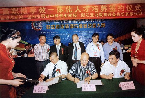 教育部高教司原副司长朱传礼(后排左三)、职成司处长刘杰(后排左二)出席签约仪式 近日,温州市职业技术学院、温州市职业中等专业学校和浙江亚龙教育装备股份有限公司三方积极探索中高职人才培养一体化改革和中高职课程衔接工作,本着友好协商的原则签订双元制中高职做学教一体化人才培养合作协议。