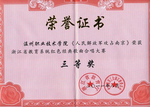日前,从浙江省教育厅传来喜讯:在全省教育系统红色经典歌曲合唱大赛中我院荣获优秀组织奖,参赛的曲目《人民解放军攻占南京》获合唱大赛三等奖。这是我院教工合唱团自成立以来获得的首个省级奖项。