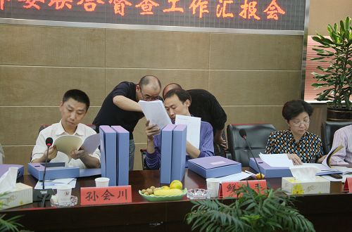 督查组查看汇报材料 10月21日下午,由教育部、公安部、环境保护部、卫生部、工商总局、质检总局六部局组成的联合督查小组来访我院,就高校“黑心棉”查处工作情况开展联合督查。