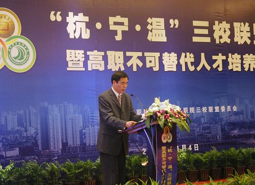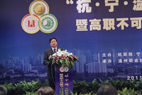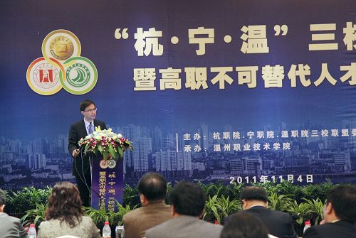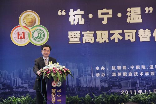 浙江省教育厅高教处处长顾玮在论坛上作重要讲话。他指出,这次研讨会以不可替代为题,彰显了职业教育在改革和发展中的重要作用,彰显了高等职业教育作为高等教育所体现的重要地位。杭州、宁波和温州是三座非常重要的城市,在全省和全国都举足轻重,杭职院、宁职院和温职院处于不同的地理位置,具有明显的合作优势,三校之间的联盟有利于促进高等职业教育的内涵建设,对推动全省高校发展具有重要意义。