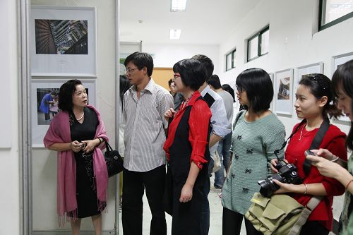 得知我校师生作品在丽水摄影节参展,温州薇薇新娘黄信乐总经理特意赶到展馆观看我院学生的摄影作品。黄总说:“你院学生作品比我上次看到的进步了很多,而且婚纱、广告类作品比重增多了,这样更加贴近市场的需求,你们的学生了不起啊。”
