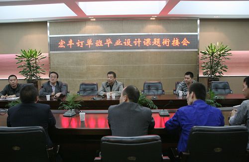探讨学生毕业设计相关合作细节 11月9日,我院在行政楼多功能厅举行了“宏丰虚拟订单班”开班仪式,60名来自机械、电气、财会系的学生成为了“宏丰班”首批学员。我院党委委员、副院长夏晓军,温州宏丰电工合金股份有限公司董事长兼总经理陈晓、常务副总经理陈乐生出席了仪式。