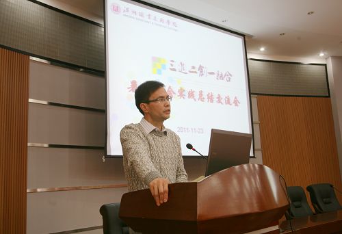 夏晓军副院长作重要讲话 11月23日,学院2011年暑期社会实践总结交流会在行政楼一楼多功能厅召开。学院院长丁金昌,党委副书记倪集崇,副院长夏晓军、王向红出席会议,暑期社会实践领导小组成员及各系副主任、系办主任、实训科科长、各专业教研室主任、思政辅导员等参加会议。会议由夏晓军副院长主持。