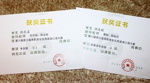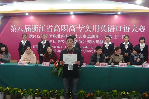 近日,第八届浙江省高职高专实用英语口语大赛暨2012年“高教杯”英语口语技能大赛浙江赛区选拔赛在金华落下帷幕,我院参赛学生全部获奖。商务英语0901班的颜承姜同学获得了英语专业组唯一的特等奖,并将在明年代表浙江省赴天津参加全国总决赛。此外,我院还获得二等奖一项和优胜奖二项。奖项分量和获奖面均为我院参加该项赛事的历史之最。