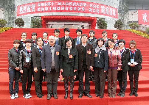 学院领导与实训学生合影留念 2012月2月18日,我院文秘专业的16位学生身着职业装来到温州市政协大楼,开始为期一周的会议服务实训。