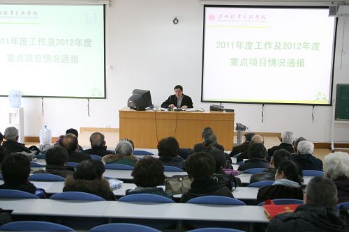 院党委书记陈光天作工作报告 3月8日上午,我院2012年离退休老干部形势报告会在成教学院召开。院党委书记陈光天在会上作工作报告,传达贯彻了市第十一次党代会精神,通报了学院2011年度工作及2012年度重点项目情况。140多名离退休老同志参加了本次会议。会议由离退休管理处处长张小加主持。