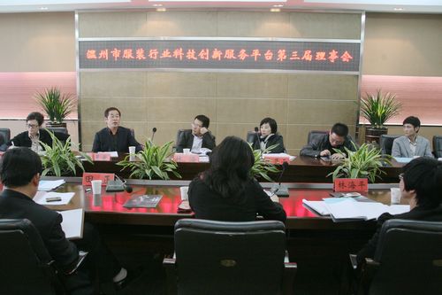 2012年4月18日,温州市服装行业科技创新服务平台第三届理事会在我院召开。温州市科技局机关党委副书记林海、温州市服装商会会长郑晨爱、我院副院长王向红以及其他核心单位的领导与代表出席本次会议。会议由我院轻工系主任田正主持。