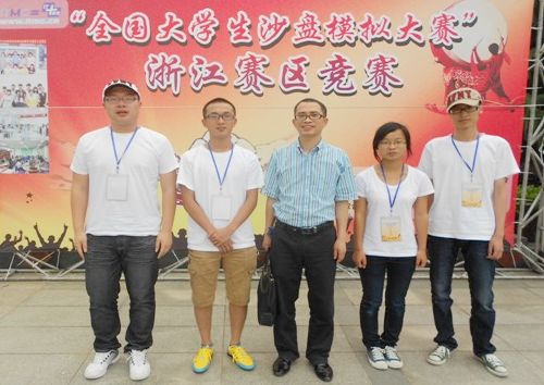 指导老师徐云旭与参赛选手合影 6月3日,2012年全国大学生沙盘模拟大赛浙江省赛区企业经营管理沙盘比赛在浙江纺织职业技术学院进行。我院工商系学生在企业管理教研室主任黄云碧、徐云旭老师的指导下出战此次比赛。企管专业林海瑞、田林念与营销专业谢尚文、陈豪4名学生组成的工商队在比赛过程中,面对开局不利的困境,迅速调整好战略,果断采用差异化战略,开辟新兴市场,在经营阶段后期实现逆转,最终在全省各高职院校的28支参赛队伍中脱颖而出,获得第二名,并与浙江金融职业技术学院、浙江纺织职业技术学院获得代表浙江省进军全国比赛的资格。这是我院学子继2009年参加该项赛事以来,第三次获得国赛参赛资格。