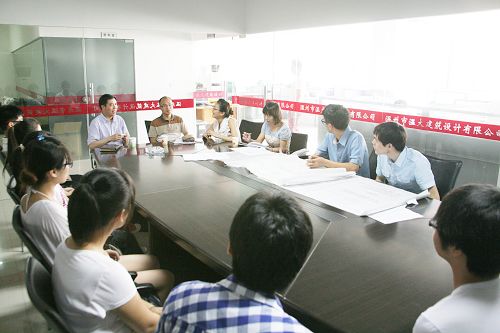 与实践师生座谈交流 7月5日上午,学院党委书记陈光天,党委委员、学工部部长蔡后界一行先后走访了温州喜来登大酒店、温大建筑设计有限公司、温州E元素模特公司,亲切慰问了在那里参加暑期社会实践的我院师生。
