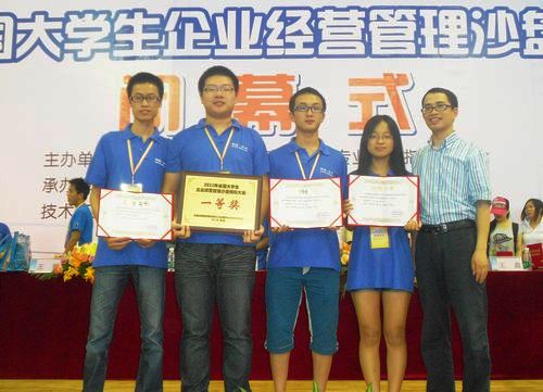 参赛队员与国赛优秀指导老师合影 7月9日,由教育部高职高专工商管理类教学指导委员会举办的“2012年全国大学生企业经营管理沙盘模拟大赛”全国总决赛在广东省中山高等专科学校圆满落幕。我院工商系由黄云碧、徐云旭等老师指导,林海瑞、谢尚文、陈豪、田林念四位同学组成的代表队,在全国130所高职院校的众多支竞赛队伍中脱颖而出,继去年勇夺一、二、三等奖后再创佳绩,荣获本届沙盘模拟大赛全国总决赛一等奖。