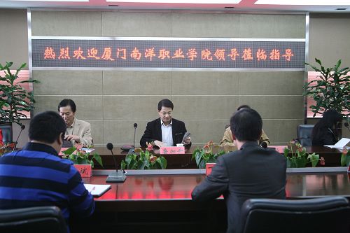 11月5日下午,厦门南洋职业学院院长鲁加升一行5人来访我院,就示范院校建设工作、实训基地建设、科研工作、中外合作办学等内容进行考察交流。在一同参观了我院的校内实训基地后,丁金昌院长于行政楼301会议室热情招待了鲁院长一行。党院办、教务处负责人出席了座谈会,双方就相关内容进行了对口交流。
