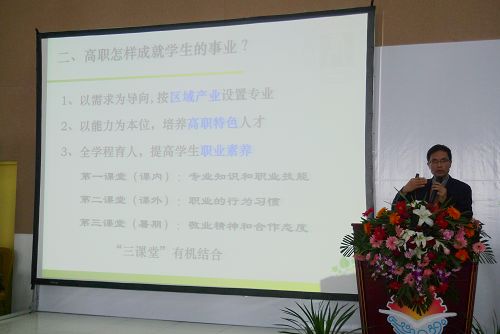 我院院长丁金昌教授在“读高职有我的事业”论坛上做主题报告,并和与参会代表进行了互动交流,引起了很大的反响。在会议期间,丁金昌院长到亚龙科技集团有限公司设备展厅,看望了在该公司工作的我院毕业生,丁金昌院长十分关心毕业生的工作和生活情况,勉励他们努力工作,为公司发展做出自己应有的贡献,为母校争光,并与他们合影留念。