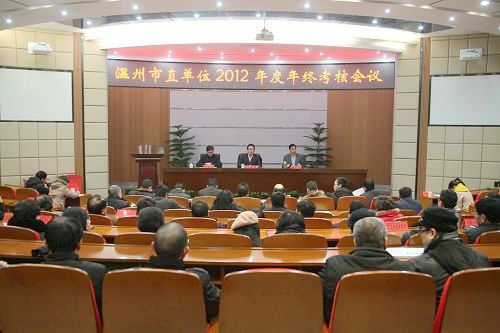 1月9日下午,由温州市政府副秘书长叶世强带队的市直单位年终考核测评小组对学院2012年工作进行年终考核。学院领导班子成员,学院在职副处及以上中层干部,学院院级及以上科研院所负责人、有关教师代表参加了年终考核会议。