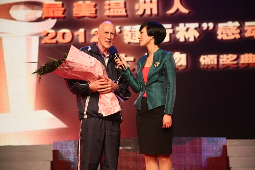 我院外籍教师伊凡•戴维斯被评为“2012•感动温州十大人物”,颁奖词这样写道:“一个外教,做着与教学不相符的小事,捡垃圾,微不足道。但一个外国人在温州捡垃圾就值得称道。山上的垃圾体现了社会的陋习,你言传的是知识,你身教的是洁净的风气。”其余九名感动温州人物分别是周震寰、柳静静、陶蛟龙(已故)、胡晓丰、徐盛亮、兰速文、陈斌、苏海和、王国双;在当晚的舞台上,无私、舍己、责任、坚强、大爱等等这些词汇,再次转化为行动,触动我们的心灵。