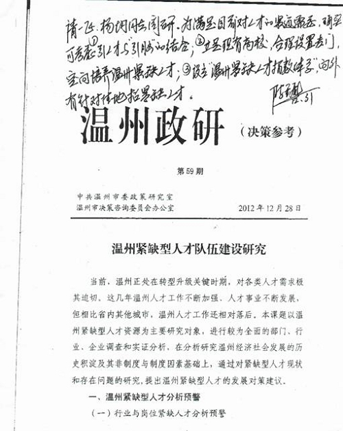由陈珉老师执笔的《温州紧缺人才队伍建设研究》课题报告此前得到了陈金彪市长的肯定批示,报告被温州市政府内刊《温州政研》录用刊登。据市委组织部同志说,报告中提出的“设立“温州紧缺人才指数体系”对策建议,目前已由市委组织部和温州人社局研究启动该项工作。这是温职院科研服务地方经济和社会能力不断提升的具体表现,也充分说明了学院“立地式”研究正在产生良好的社会效应。