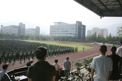 最后,陈光天书记为军训团授旗,标志着为期一周的军训工作正式启动,2013级的新生的大学生活就此拉开序幕。