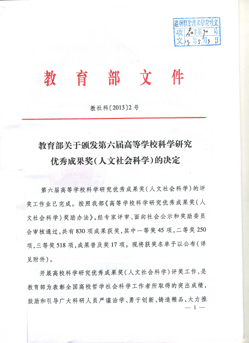 教育部关于颁发第六届高等学校科学研究优秀成果奖(人文社会科学)的决定(教社科[2013]2号),我院丁金昌教授的论文《基于“三性”的高等职业教育可持续发展研究与实践》获教育学三等奖。
