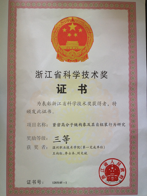 另外,浙江省人民政府关于2012年度浙江省科学技术奖励的决定(浙政发[2013]29号),我院王向红教授的项目《紧密高分子链构象及其自组装行为研究》荣获浙江省科技进步奖三等奖。